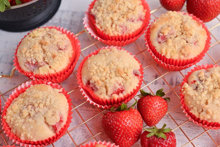 Tip: If using frozen strawberries, thaw slightly and chop so that the muffins bake evenly.